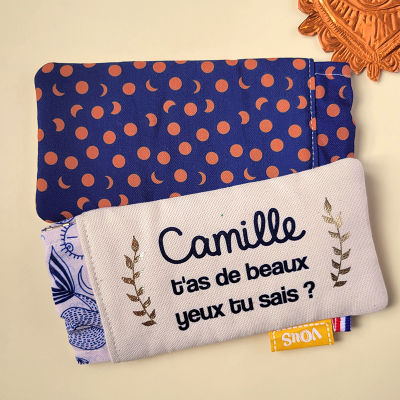 Une face écrue pour personnaliser, l'autre avec un de nos sublimes tissus 😉. Pour protéger ses lunettes des rayures et grains de sable. Jolie fermeture "clic-clac" métallique permettant aux lunettes de ne pas s'échapper ! Doublure molletonnée en coton.