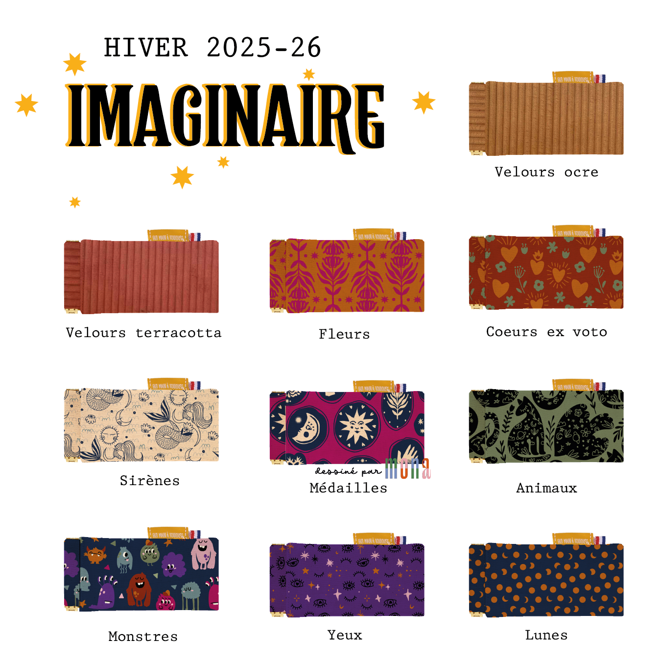 • Tissus à motifs dessinés & imprimés dans notre atelier.