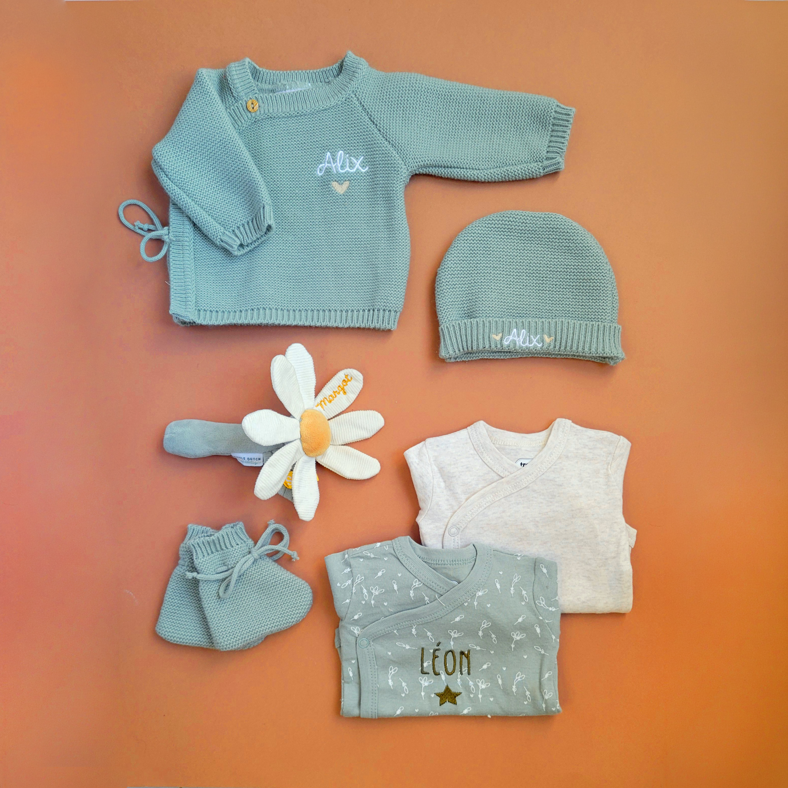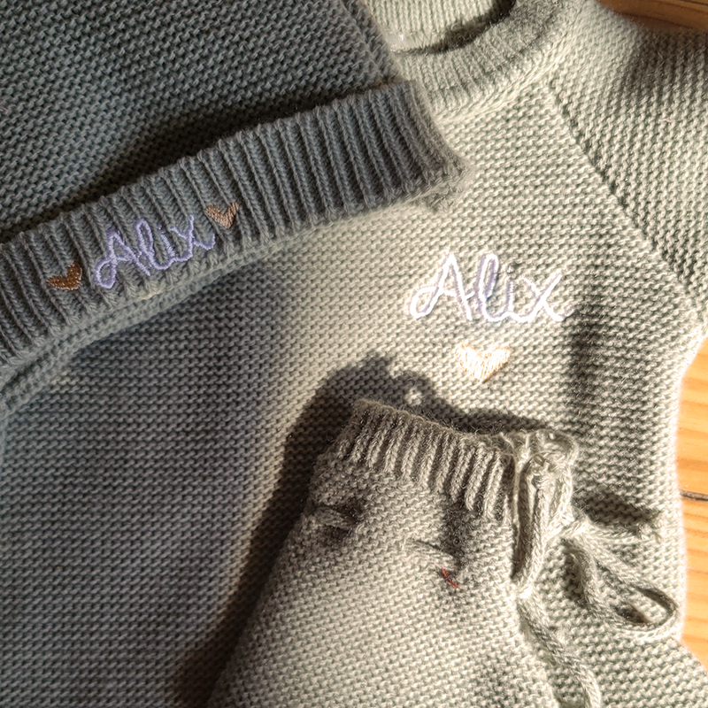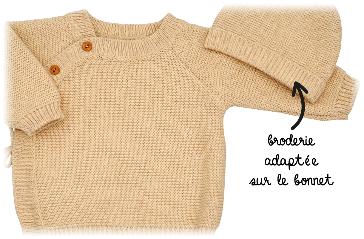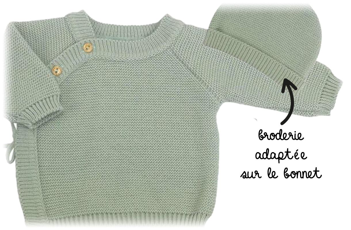 Joli trousseau de naissance en maille. Avec son ouverture boutonnée et le petit nœud, le gilet s'enfile facilement et permettent d’habiller bébé sans passer par la tête. Broderie côté cœur, également adaptée au bonnet.