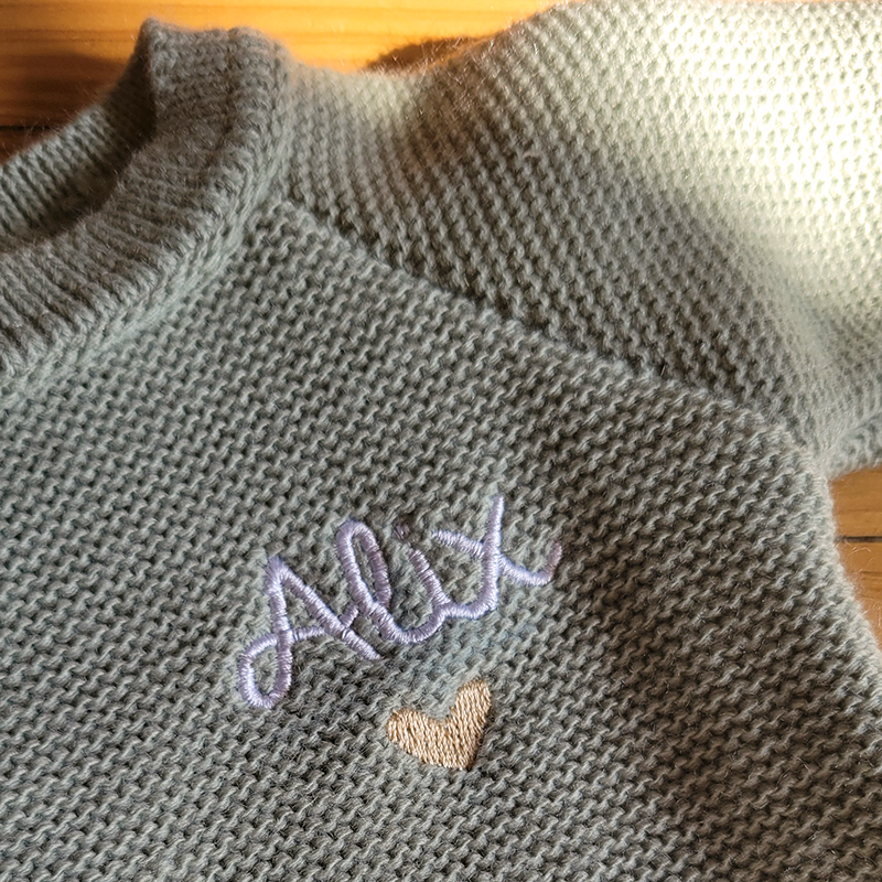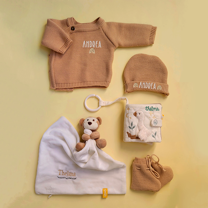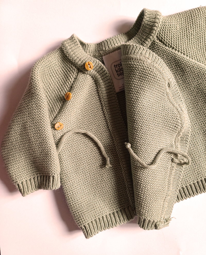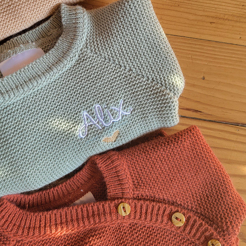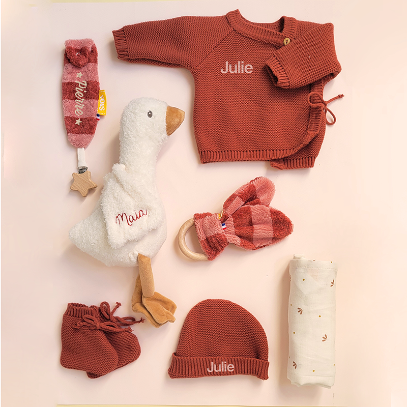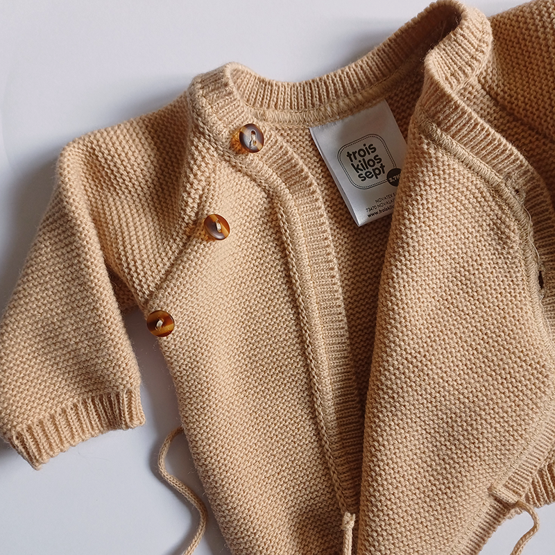 Joli trousseau de naissance en maille. Avec son ouverture boutonnée et le petit nœud, le gilet s'enfile facilement et permettent d’habiller bébé sans passer par la tête. Broderie côté cœur, également adaptée au bonnet.